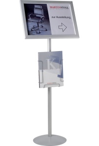 Hochwertiger Ständer aus silberfarbig eloxierten Aluminiumprofilen. Die Rahmenprofile lassen sich einfach auf- und zuklappen, so dass ein Wechsel der Informationen im Handumdrehen erledigt ist. Die eingelegten Blätter werden durch die transparente Antireflex-Schutzscheibe geschützt. Der Rundfuß des mobilen Ständers garantiert einen sicheren Stand und läßt auch Einsätze im Freien zu.