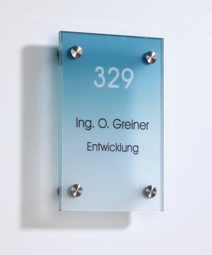 Mit diesem repräsentativen Beschilderungssystem informieren und beeindrucken Sie Ihre Gäste stilvoll. Das flexible Programm passt sich Ihrem Corporate Design perfekt an. Gehärtetes Einscheibensicherheitsglas (ESG) sowie Halter aus Edelstahl bieten auch eine optimale Funktionalität.