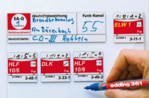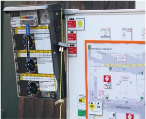 • Durch das zusätzliche Trägerprofil kann auch die Atemschutzüberwachungstafel (mit einer Aufhänge- vorrichtung für die Leitersprosse) neben der Lagedarstellung angebracht werden.