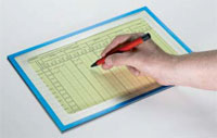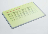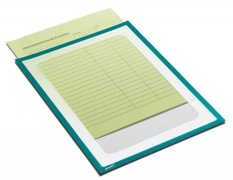 Selbstklebende Ausführung, mit großem Ausschnitt für handschriftliche Eintragungen direkt auf dem Blatt Einfacher Blattwechsel durch die obere Taschenöffnung