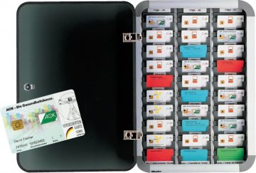 mit abschließbarer, getönter Plexiglastüre. Die Kartenhalter können einzeln beschriftet werden. Die Etiketten werden mitgeliefert. Rechtlich dürfen die Chip-Karten nur mit dem Einverständnis der Eigentümer verwaltet werden. Vorgedruckte Einverständniserklärungen werden mitgeliefert. Farbige Einsteckkarten sind in ausreichender Menge inklusive.